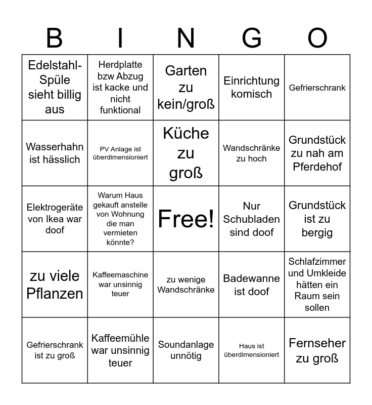 This bingo card has a free space and 24 words: Kaffeemaschine war unsinnig teuer, Kaffeemühle war unsinnig teuer, Küche zu groß, Gefrierschrank ist zu groß, Gefrierschrank, Edelstahl-Spüle sieht billig aus, Wasserhahn ist hässlich, Herdplatte bzw Abzug ist kacke und nicht funktional, Nur Schubladen sind doof, zu wenige Wandschränke, Wandschränke zu hoch, Elektrogeräte von Ikea war doof, Badewanne ist doof, Schlafzimmer und Umkleide hätten ein Raum sein sollen, PV Anlage ist überdimensioniert, Haus ist überdimensioniert, Grundstück ist zu bergig, Garten zu kein/groß, Grundstück zu nah am Pferdehof, Warum Haus gekauft anstelle von Wohnung die man vermieten könnte?, Fernseher zu groß, zu viele Pflanzen, Einrichtung komisch and Soundanlage unnötig.