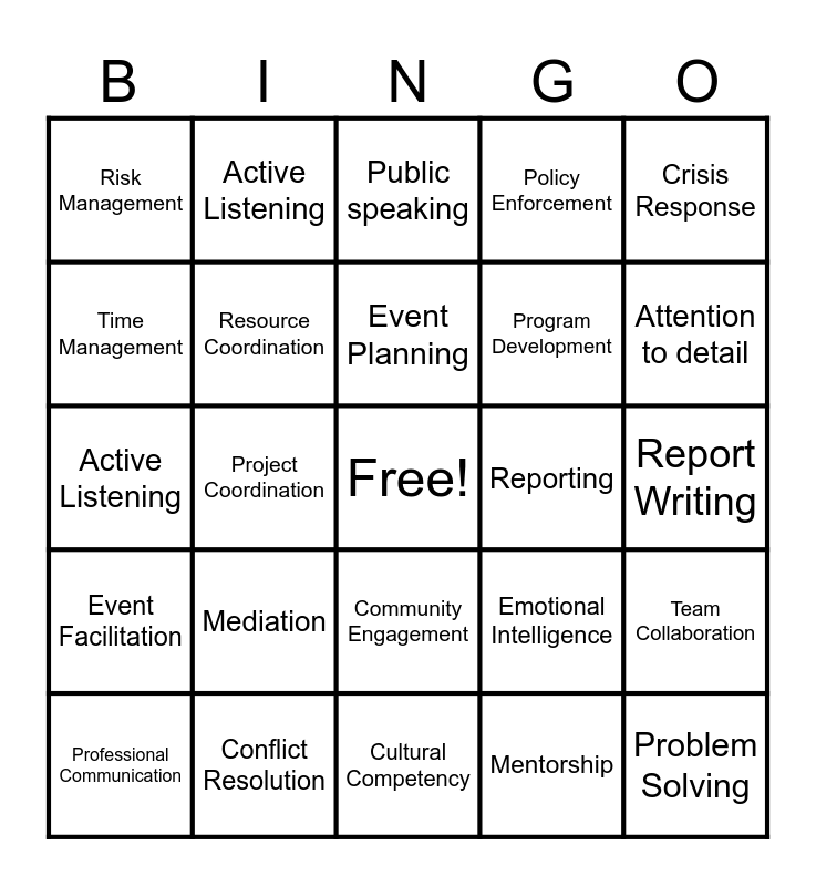 This bingo card has a free space and 24 words: Mediation, Conflict Resolution, Event Planning, Professional Communication, Crisis Response, Risk Management, Time Management, Active Listening, Reporting, Community Engagement, Program Development, Active Listening, Emotional Intelligence, Team Collaboration, Resource Coordination, Mentorship, Report Writing, Public speaking, Attention to detail, Project Coordination, Problem Solving, Event Facilitation, Policy Enforcement and Cultural Competency.