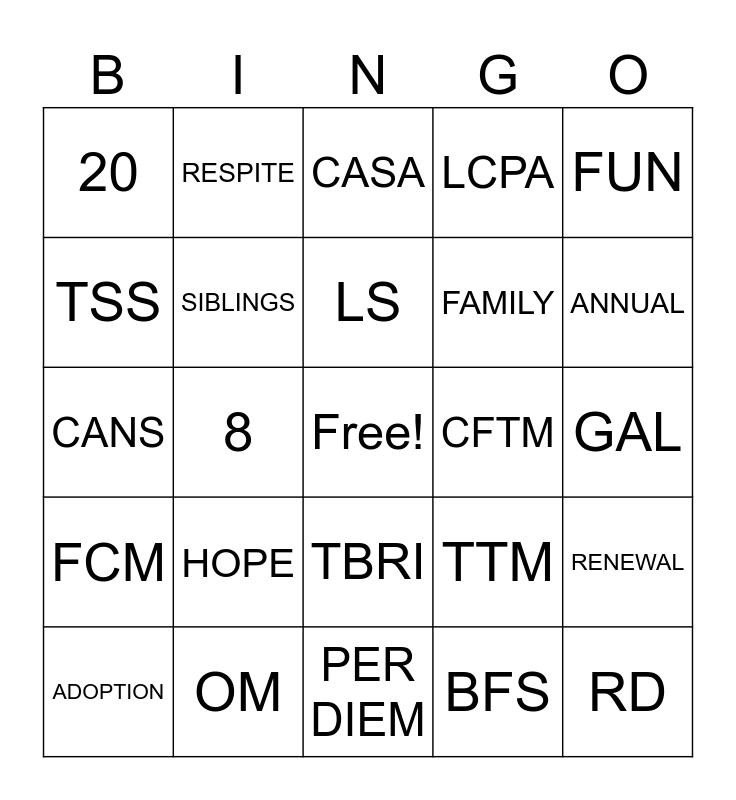 This bingo card has a free space and 24 words: HOPE, OM, LS, ADOPTION, FUN, 20, TSS, RESPITE, CFTM, TBRI, FAMILY, CANS, TTM, RENEWAL, SIBLINGS, BFS, GAL, CASA, ANNUAL, 8, RD, FCM, LCPA and PER DIEM.