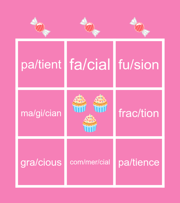 This bingo card has a free space and 8 words: frac/tion, fu/sion, fa/cial, gra/cious, pa/tient, pa/tience, ma/gi/cian and com/mer/cial.