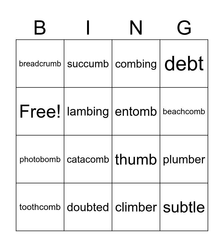 This bingo card has 16 words: doubted, plumber, combing, breadcrumb, photobomb, succumb, thumb, climber, Free!, lambing, toothcomb, debt, catacomb, beachcomb, entomb and subtle.