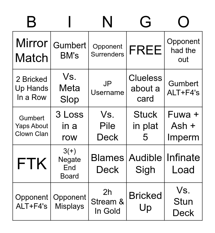 This bingo card has 30 words: Opponent Misplays, Gumbert Misplays, 3 Loss in a row, 3 Win in a row, Mirror Match, Opponent Surrenders, Vs. Meta Slop, Blames Deck, Stuck in plat 5, 2h Stream & In Gold, Fuwa + Ash + Imperm, Vs. Pile Deck, Bricked Up, Vs. Stun Deck, Gumbert ALT+F4's, Gumbert Surrenders, Audible Sigh, FTK, 3(+) Negate End Board, Opponent had the out, Gumbert Yaps About Clown Clan, Opponent BM's, Gumbert BM's, Clueless about a card, 2 Bricked Up Hands In a Row, FREE, Infinate Load, Opponent ALT+F4's, JP Username and Blue-Eyes or Dark Magician.