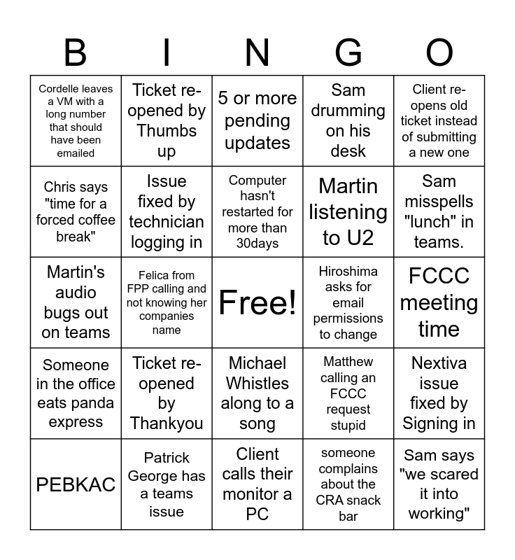 This bingo card has a free space and 24 words: Ticket re-opened by Thankyou, Patrick George has a teams issue, Computer hasn't restarted for more than 30days, PEBKAC, Client re-opens old ticket instead of submitting a new one, Cordelle leaves a VM with a long number that should have been emailed, Chris says "time for a forced coffee break", Ticket re-opened by Thumbs up, Hiroshima asks for email permissions to change, Michael Whistles along to a song, Martin listening to U2, Martin's audio bugs out on teams, Matthew calling an FCCC request stupid, Nextiva issue fixed by Signing in, Issue fixed by technician logging in, someone complains about the CRA snack bar, FCCC meeting time, 5 or more pending updates, Sam misspells "lunch" in teams., Felica from FPP calling and not knowing her companies name, Sam says "we scared it into working", Someone in the office eats panda express, Sam drumming on his desk and Client calls their monitor a PC.