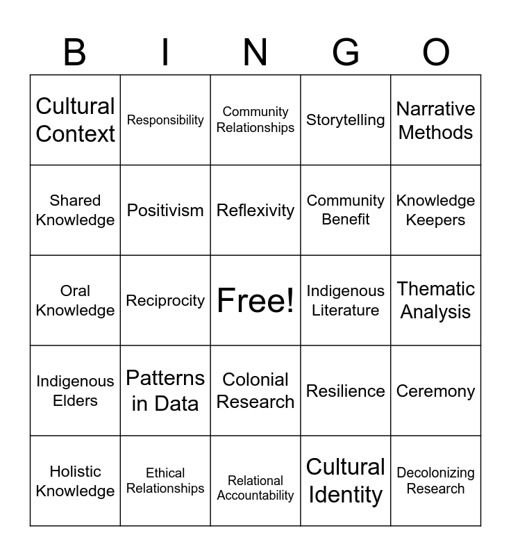 This bingo card has a free space and 24 words: Patterns in Data, Ethical Relationships, Reflexivity, Holistic Knowledge, Narrative Methods, Cultural Context, Shared Knowledge, Responsibility, Indigenous Literature, Colonial Research, Community Benefit, Oral Knowledge, Resilience, Ceremony, Positivism, Cultural Identity, Thematic Analysis, Community Relationships, Knowledge Keepers, Reciprocity, Decolonizing Research, Indigenous Elders, Storytelling and Relational Accountability.