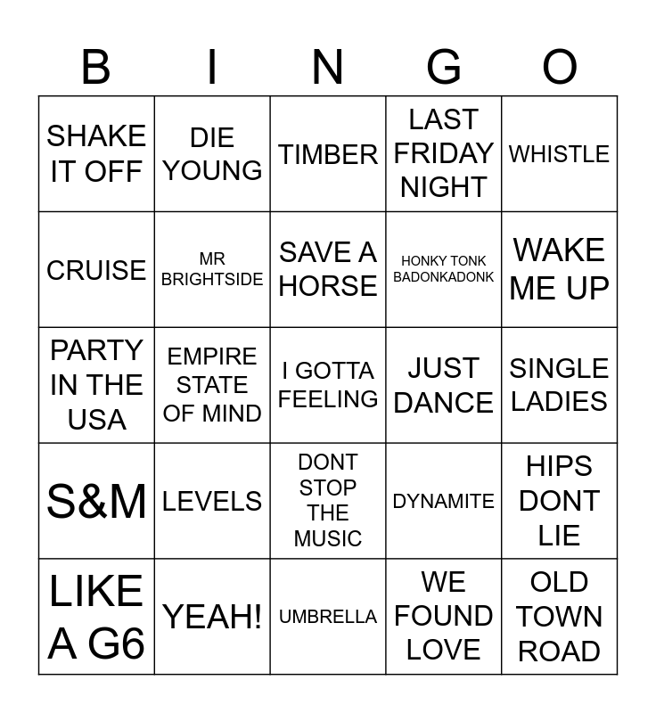 This bingo card has 45 words: TIME OF OUR LIVES, I GOTTA FEELING, PARTY ROCK ANTHEM, LIKE A G6, GOOD FEELING, WE FOUND LOVE, TIMBER, THE NIGHTS, WHISTLE, YEAH!, LAST FRIDAY NIGHT, JUST DANCE, DONT STOP THE MUSIC, LEVELS, CANT STOP THE FEELING, UMBRELLA, TIK TOK, PARTY IN THE USA, HAPPY, WAKE ME UP, DIE YOUNG, POKER FACE, BEAUTIFUL GIRLS, SHAKE IT OFF, GANGNAM STYLE, SINGLE LADIES, ROCK YOUR BODY, GASOLINA, DYNAMITE, S&M, CANT HOLD US, HIPS DONT LIE, TOXIC, RIGHT ROUND, HOTEL ROOM SERVICE, EMPIRE STATE OF MIND, CAKE BY THE OCEAN, SHOTS, OLD TOWN ROAD, SAVE A HORSE, CRUISE, HONKY TONK BADONKADONK, COUNTRY GIRLS, MR BRIGHTSIDE and REHAB.