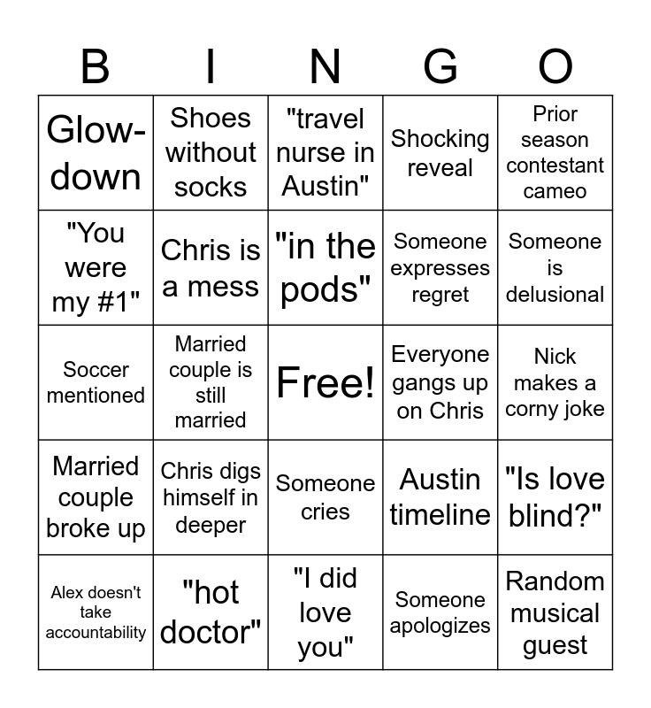 This bingo card has a free space and 40 words: Answered prayer/gift from god, Soccer mentioned, Soccer mentioned again, Chris is a mess, "hot doctor", Someone cries, "in the pods", Pod Squad cameo, Prior season contestant cameo, Married couple broke up, Married couple is still married, Shocking reveal, Random musical guest, Nick makes a corny joke, Everyone gangs up on Chris, Chris digs himself in deeper, Glow-up, Glow-down, "nomadic", "travel nurse in Austin", "Is love blind?", Someone apologizes, Someone expresses regret, "You were my #1", A couple that didn't get married is still dating, Video montage of a couple's time together since the wedding, Gold cup, "O-H...I-O!", Cut to audience disapproval, A contestant is in a relationship outside of LIB, Someone storms off, Alex doesn't take accountability, The box mentioned, Austin timeline, Someone is delusional, "I did love you", "I want kids", "I learned a lot", Shoes without socks and "sight unseen".