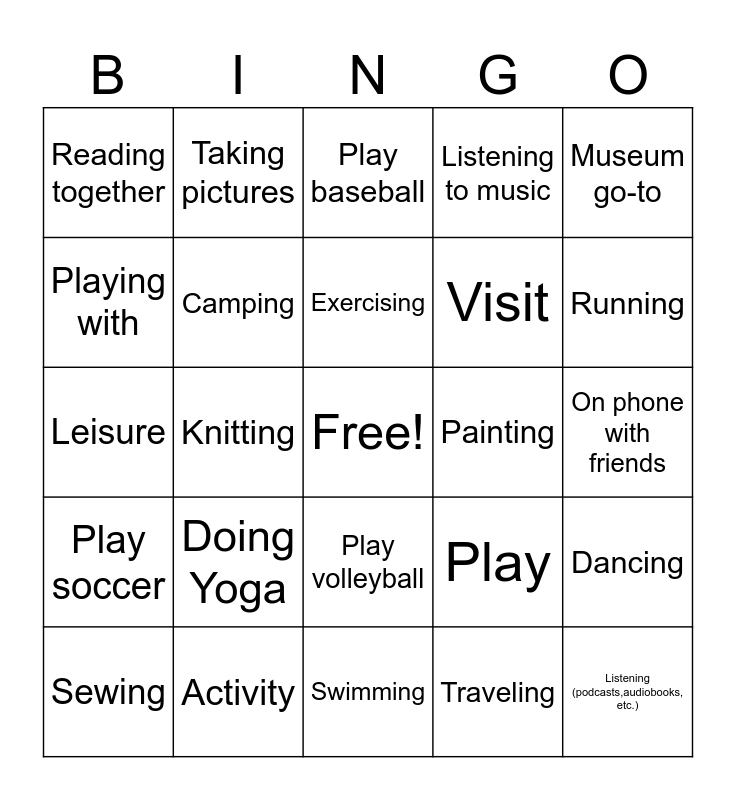This bingo card has a free space and 37 words: Bowling, Cooking, Cycling, Camping, Dancing, Doing Yoga, Exercising, Fishing, Museum go-to, Hanging out with, Knitting, Listening to music, Listening (podcasts,audiobooks, etc.), On phone with friends, Playing with, Play soccer, Play basketball, Play baseball, Play volleyball, Painting, Reading together, Running, Sewing, Swimming, Sleeping, Traveling, Taking pictures, Visit family, Video Gaming, Watching TV, Walking, Activity, Leisure, Hobby, Play, Visit and Watch.