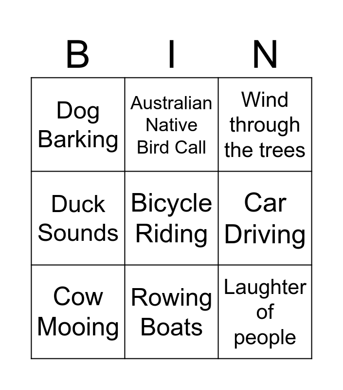 This bingo card has 12 words: River Rushing, Laughter of people, Bicycle Riding, Car Driving, Australian Native Bird Call, Wind through the trees, Rowing Boats, Jogger Running, Dog Barking, Duck Sounds, Cow Mooing and Delivery Truck.