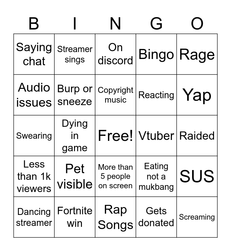 This bingo card has a free space and 24 words: Pet visible, Fortnite win, Copyright music, Dancing streamer, Rage, Saying chat, Audio issues, Streamer sings, Vtuber, More than 5 people on screen, Reacting, Swearing, Eating not a mukbang, SUS, Burp or sneeze, Gets donated, Raided, On discord, Yap, Dying in game, Screaming, Less than 1k viewers, Bingo and Rap Songs.