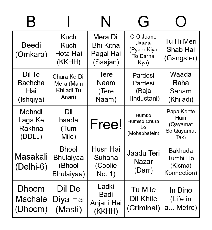 This bingo card has a free space and 75 words: Pehla Nasha (Jo Jeeta Wohi Sikandar), Tujhe Dekha To (DDLJ), Mera Dil Bhi Kitna Pagal Hai (Saajan), Dheere Dheere Se (Aashiqui), Ek Ladki Ko Dekha (1942: A Love Story), Tu Hi Re (Bombay), Hoshwalon Ko Khabar Kya (Sarfarosh), Tum Se Hi (Jab We Met), Main Yahaan Hoon (Veer-Zaara), Zara Zara (RHTDM), Suraj Hua Maddham (K3G), Khuda Jaane (Bachna Ae Haseeno), Tere Naam (Tere Naam), Dil To Bachcha Hai (Ishqiya), Sajdaa (My Name Is Khan), Dil Ibaadat (Tum Mile), Tujhe Bhula Diya (Anjaana Anjaani), In Dino (Life in a... Metro), Pee Loon (Once Upon a Time in Mumbaai), Tu Hi Meri Shab Hai (Gangster), Dil To Pagal Hai (DTPH), Mehndi Laga Ke Rakhna (DDLJ), Chura Ke Dil Mera (Main Khiladi Tu Anari), Kuch Kuch Hota Hai (KKHH), O O Jaane Jaana (Pyaar Kiya To Darna Kya), Chand Sifarish (Fanaa), Haule Haule (Rab Ne Bana Di Jodi), Kaho Naa... Pyaar Hai (KNPH), Na Tum Jaano Na Hum (KNPH), Agar Main Kahoon (Lakshya), Tum Dil Ki Dhadkan Mein (Dhadkan), Dil Ne Yeh Kaha Hain (Dhadkan), Baazigar O Baazigar (Baazigar), Jaadu Teri Nazar (Darr), Waada Raha Sanam (Khiladi), Pardesi Pardesi (Raja Hindustani), Aaye Ho Meri Zindagi (Raja Hindustani), Jo Haal Dil Ka (Sarfarosh), Papa Kehte Hain (Qayamat Se Qayamat Tak), Tu Mile Dil Khile (Criminal), Chaiyya Chaiyya (Dil Se..), Tip Tip Barsa Paani (Mohra), Ye Kaali Kaali Aankhen (Baazigar), Ole Ole (Yeh Dillagi), Mauja Hi Mauja (Jab We Met), Kajra Re (Bunty Aur Babli), Dhoom Machale (Dhoom), Beedi (Omkara), Ankhiyon Se Goli Maare (Dulhe Raja), Tan Tana Tan (Judwaa), Chunari Chunari (Biwi No.1), Husn Hai Suhana (Coolie No. 1), Sona Kitna Sona Hai (Hero No. 1), What is Mobile Number (Haseena Maan Jaayegi), Mera Piya Ghar Aaya (Yaraana), Tamma Tamma Loge (Thanedaar), Chane Ke Khet Mein (Anjaam), Ek Do Teen (Tezaab), Didi Tera Devar Deewana (HAHK), Kabootar Ja Ja Ja (Maine Pyar Kiya), Bhool Bhulaiyaa (Bhool Bhulaiyaa), You Are My Soniya (K3G), Jhalak Dikhla Ja (Aksar), Badtameez Dil (YJHD), Lift Karadey (Adnan Sami), Humko Humise Chura Lo (Mohabbatein), Kal Ho Naa Ho (Kal Ho Naa Ho), Mitwa (KANK), Woh Lamhe (Zeher), Bakhuda Tumhi Ho (Kismat Konnection), Masakali (Delhi-6), Dil De Diya Hai (Masti), Aashiq Banaya Aapne (Aashiq Banaya Aapne), Ladki Badi Anjani Hai (KKHH) and Zara Sa (Jannat).