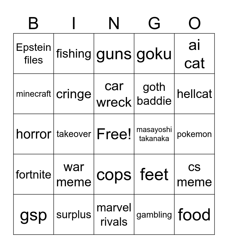 This bingo card has a free space and 24 words: war meme, surplus, car wreck, gsp, ai cat, Epstein files, minecraft, fishing, masayoshi takanaka, cops, goth baddie, horror, feet, cs meme, cringe, gambling, pokemon, guns, hellcat, takeover, food, fortnite, goku and marvel rivals.