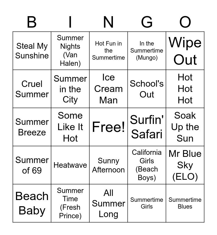 This bingo card has a free space and 54 words: Surfin' USA, Summer of 69, Boys of Summer, Summer Nights (Grease), Sunny Afternoon, Walking on Sunshiine, In the Summertime (Mungo), California Girls (Katy Perry), Cruel Summer, Island in the Sun, Steal My Sunshine, Hot In Herre, Summer Time (Fresh Prince), Beach Baby, Cool for the Summer, All Summer Long, Summertime Blues, School's Out, Good Day Sunshine, Soak Up the Sun, California Girls (Beach Boys), California Dreamin', Surfin' Safari, Wipe Out, Surfer Girl, Summer Nights (Van Halen), Suddenly Last Summer, Kokomo, Magic (The Cars), Summertime Girls, Blue Sky (Allman Bros), Hot In The City, Rock Lobster, Rockaway Beach, Hot Fun in the Summertime, Saturday in the Park, Summer Breeze, Mr Blue Sky (ELO), Vacation, Summer in the City, Sittin' on the Dock of the Bay, Magaritaville, Under The Boardwalk, Cake by the Ocean, Heatwave, The Heat is On, Tequila Sunrise, Walking On the Sun, Ice Cream Man, Some Like It Hot, Hot Hot Hot, Dancing in the Street, Too Hot and Heat of the Moment.