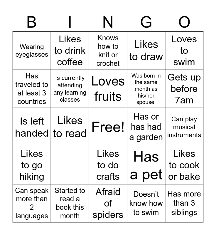 This bingo card has a free space and 25 words: , Afraid of spiders, Loves fruits, Can speak more than 2 languages, Loves to swim, Wearing eyeglasses, Has traveled to at least 3 countries, Likes to drink coffee, Has or has had a garden, Likes to do crafts, Was born in the same month as his/her spouse , Is left handed, Has a pet, Likes to cook or bake, Is currently attending any learning classes, Had broken bone, Can play musical instruments, Knows how to knit or crochet, Gets up before 7am, Likes to read, Has more than 3 siblings, Started to read a book this month, Likes to go hiking, Likes to draw and Doesn’t know how to swim.