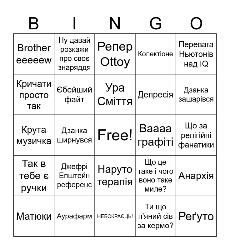 This bingo card has a free space and 24 words: Джефрі Епштейн референс, Аурафарм, Ура Сміття, Матюки, Перевага Ньютонів над IQ, Brother eeeeew, Кричати просто так, Ну давай розкажи про своє знаряддя, Ваааа графіті, Наруто терапія, Депресія, Крута музичка, Що це таке і чого воно таке миле?, Анархія, Єбейший файт, Ти що п'яний сів за кермо?, Що за релігійні фанатики, Репер Ottoy, Дзанка зашарівся, Дзанка ширнувся, Реґуто, Так в тебе є ручки, Колектіоне and НЕБОКРАЄЦЬ!.