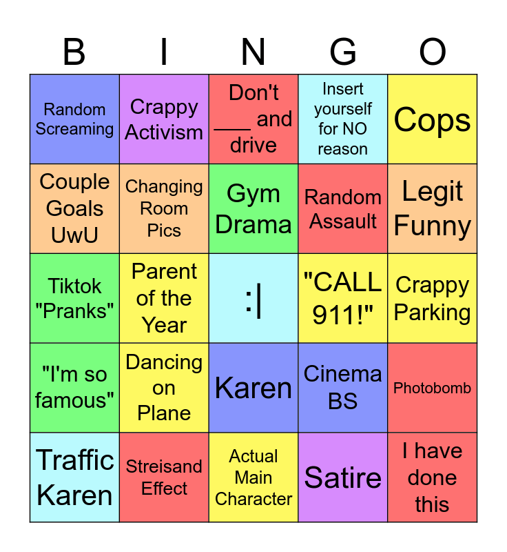 This bingo card has a free space and 24 words: Dancing on Plane, Streisand Effect, Gym Drama, Traffic Karen, Cops, Random Screaming, Couple Goals UwU, Crappy Activism, "CALL 911!", Karen, Random Assault, Tiktok "Pranks", Cinema BS, Photobomb, Changing Room Pics, Satire, Crappy Parking, Don't ___ and drive, Legit Funny, Parent of the Year, I have done this, "I'm so famous", Insert yourself for NO reason and Actual Main Character.
