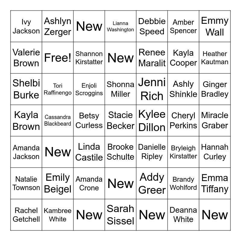 This bingo card has a free space and 48 words: Addy Greer, Kayla Cooper, Sarah Sissel, Cassandra Blackbeard, Enjoli Scroggins, Miracle Graber, Ashlyn Zerger, Kambree White, Amber Spencer, Brooke Schulte, Emmy Wall, Lianna Washington, Ashly Shinkle, Jenni Rich, Natalie Townson, Cheryl Perkins, Valerie Brown, Heather Kautman, Brandy Wohlford, Debbie Speed, Renee Maralit, Betsy Curless, Ivy Jackson, Free!, Emma Tiffany, Shannon Kirstatter, Ginger Bradley, Rachel Getchell, Shonna Miller, Tori Raffinengo, Deanna White, Kylee Dillon, Hannah Curley, Emily Beigel, Kayla Brown, Danielle Ripley, Bryleigh Kirstatter, Shelbi Burke, Linda Castile, Amanda Crone, Amanda Jackson, New, New, New, New, New, New and New.