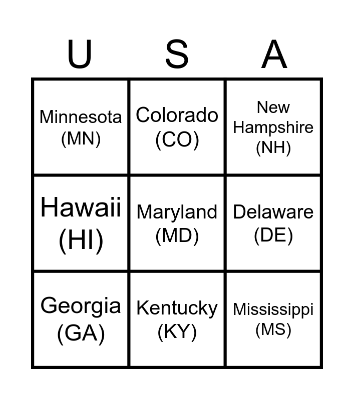 This bingo card has 50 words: Alabama (AL), Alaska (AK), Arizona (AZ), Arkansas (AR), Illinois (IL), California (CA), Colorado (CO), Connecticut (CT), Delaware (DE), Florida (FL), Georgia (GA), Hawaii (HI), Idaho (ID), Indiana (IN), Iowa (IA), Kansas (KS), Kentucky (KY), Louisiana (LA), Maine (ME), Maryland (MD), Massachusetts (MA), Michigan (MI), Minnesota (MN), Mississippi (MS), Missouri (MO), Montana (MT), Nebraska (NE), Nevada (NV), New Hampshire (NH), New Jersey (NJ), New Mexico (NM), New York (NY), North Carolina (NC), North Dakota (ND), Ohio (OH), Oklahoma (OK), Oregon (OR), Pennsylvania (PA), Rhode Island (RI), South Carolina (SC), South Dakota (SD), Tennessee (TN), Texas (TX), Utah (UT), Vermont (VT), Virginia (VA), Washington (WA), West Virginia (WV), Wisconsin (WI) and Wyoming (WY).