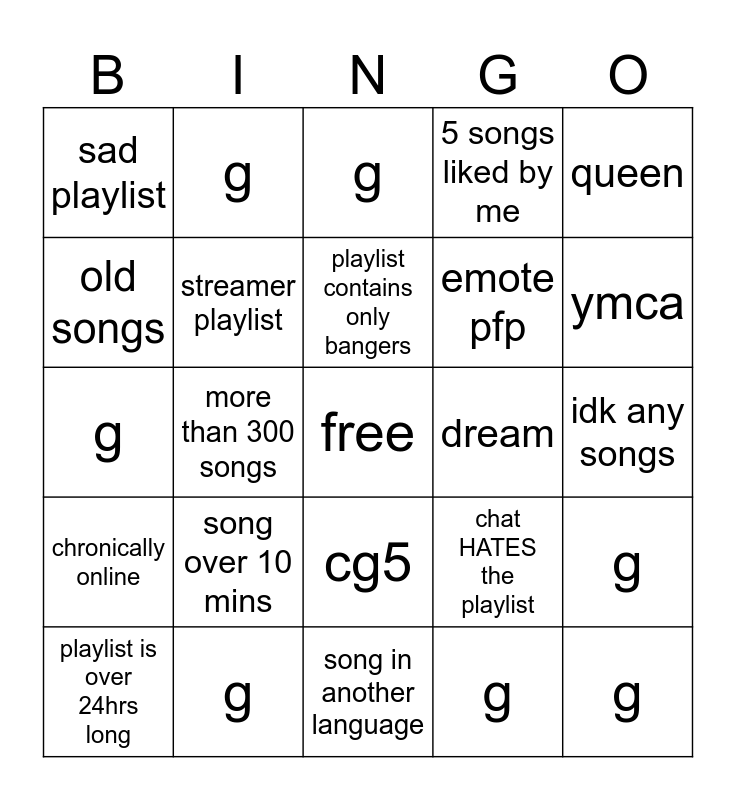 This bingo card has 39 words: 3 lovejoy songs in one, game ost, weird pfp, streamer playlist, playlist is over 24hrs long, cg5, playlist contains only bangers, musicals, queen, chronically online, more than 300 songs, 5 songs liked by me, free, idk any songs, dream, song over 10 mins, jacob reference, sad playlist, tiktok songs, chat HATES the playlist, old songs, song in another language, emote pfp, ymca, less than 10 songs, g, g, g, g, g, g, g, g, g, g, g, g, g and g.