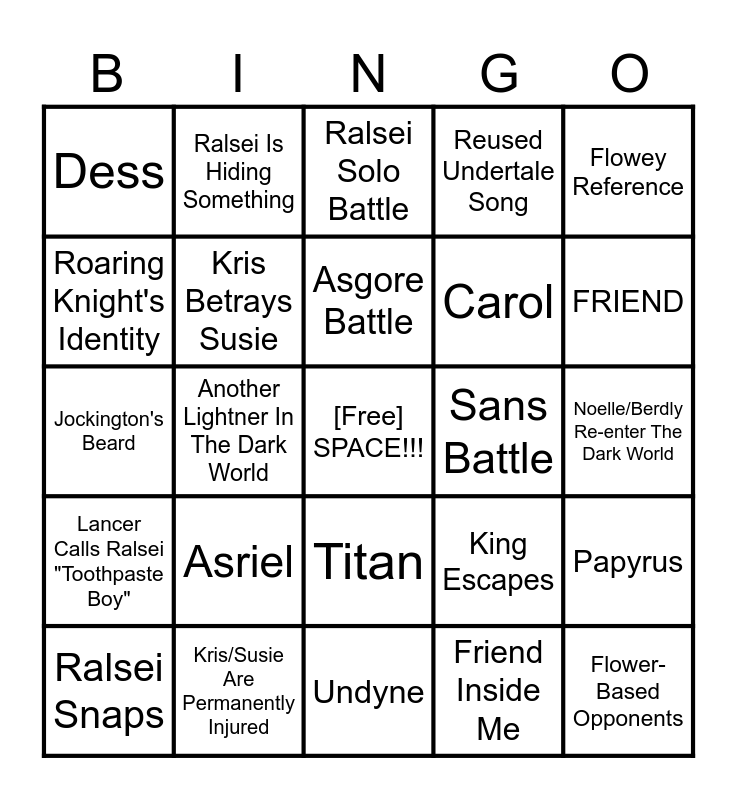 This bingo card has a free space and 24 words: Asriel, Kris/Susie Are Permanently Injured, Asgore Battle, Ralsei Snaps, Flowey Reference, Dess, Roaring Knight's Identity, Ralsei Is Hiding Something, Sans Battle, Titan, Carol, Jockington's Beard, King Escapes, Papyrus, Kris Betrays Susie, Friend Inside Me, Noelle/Berdly Re-enter The Dark World, Ralsei Solo Battle, FRIEND, Another Lightner In The Dark World, Flower-Based Opponents, Lancer Calls Ralsei "Toothpaste Boy", Reused Undertale Song and Undyne.