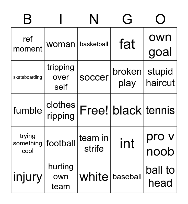 This bingo card has a free space and 24 words: football, hurting own team, soccer, injury, own goal, ref moment, skateboarding, woman, black, team in strife, broken play, fumble, int, pro v noob, tripping over self, baseball, tennis, basketball, stupid haircut, clothes ripping, ball to head, trying something cool, fat and white.