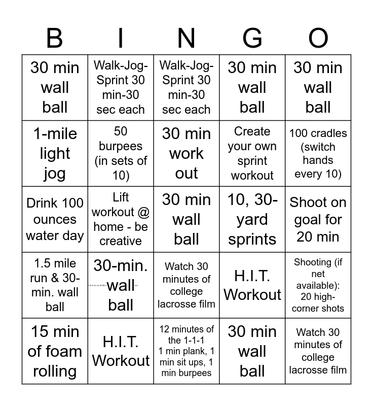 This bingo card has 1 images and 25 words: 30-min. wall ball, 12 minutes of the 1-1-1 1 min plank, 1 min sit ups, 1 min burpees, 30 min work out, 15 min of foam rolling, 30 min wall ball, 30 min wall ball, 1-mile light jog, Walk-Jog-Sprint 30 min-30 sec each, 10, 30-yard sprints, Watch 30 minutes of college lacrosse film, Create your own sprint workout, Drink 100 ounces water day, H.I.T. Workout, Shooting (if net available): 20 high-corner shots, 50 burpees (in sets of 10), Watch 30 minutes of college lacrosse film, Shoot on goal for 20 min, Walk-Jog-Sprint 30 min-30 sec each, 100 cradles (switch hands every 10), Lift workout @ home - be creative, 30 min wall ball, H.I.T. Workout, 1.5 mile run & 30-min. wall ball, 30 min wall ball and 30 min wall ball.