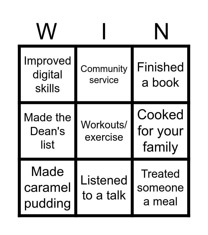 This bingo card has 9 words: Made caramel pudding, Finished a book, Community service, Made the Dean's list, Improved digital skills, Cooked for your family, Workouts/ exercise, Treated someone a meal and Listened to a talk.
