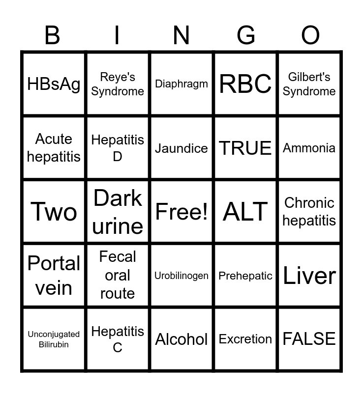 This bingo card has a free space and 24 words: Fecal oral route, Hepatitis C, Jaundice, Unconjugated Bilirubin, Gilbert's Syndrome, HBsAg, Acute hepatitis, Reye's Syndrome, ALT, Urobilinogen, TRUE, Two, Prehepatic, Liver, Hepatitis D, Excretion, Chronic hepatitis, Diaphragm, Ammonia, Dark urine, FALSE, Portal vein, RBC and Alcohol.