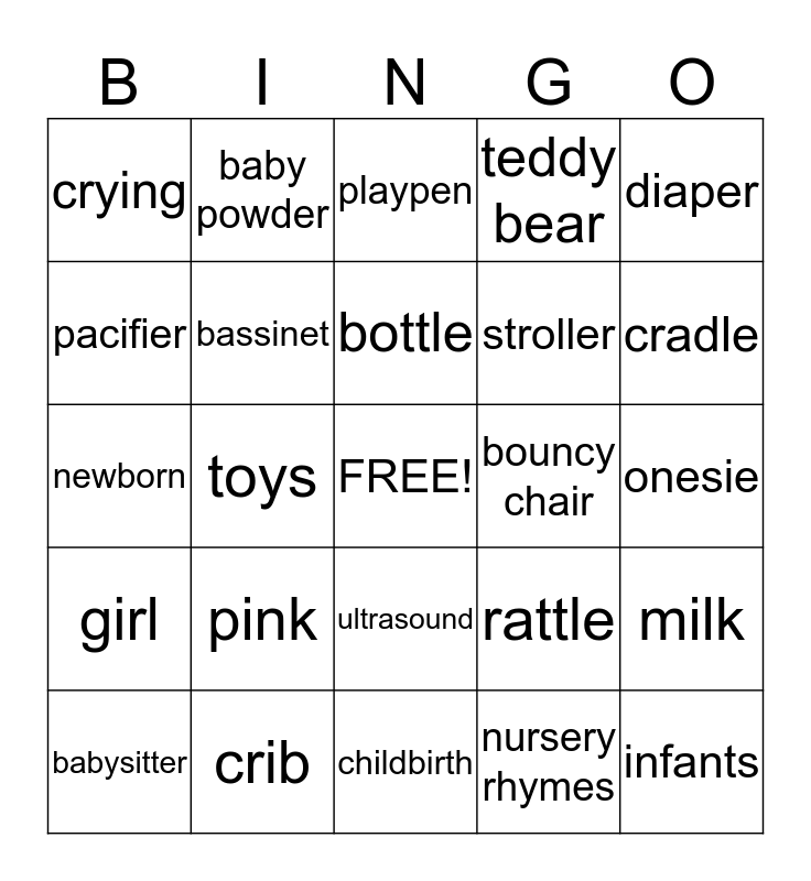 This bingo card has a free space and 24 words: pink, crib, bottle, babysitter, diaper, crying, pacifier, baby powder, bouncy chair, ultrasound, stroller, newborn, rattle, milk, bassinet, nursery rhymes, onesie, playpen, cradle, toys, infants, girl, teddy bear and childbirth.