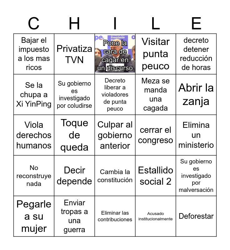 This bingo card has 1 images and 38 words: No bajarse el sueldo, Dice gobierno de emergencia, Meter a familiares al gobierno, Su gobierno es investigado por coludirse, Su gobierno es investigado por malversación, Decir depende, Decreto liberar a violadores de punta peuco, decreto reducción de presupuesto, decreto detener reducción de horas, Meza se manda una cagada, Toque de queda, Visitar punta peuco, Culpar al gobierno anterior, Elimina un ministerio, Se la chupa a Xi YinPing, No reconstruye nada, Aumentar edad para pensionarse, Pone la cara de cagar en un discurso, Se la chupa a D. trump, cerrar el congreso, Bajar el impuesto a los mas ricos, Enviar tropas a una guerra, Abrir la zanja, Pegarle a su mujer, cambiar ministros, Eliminar las contribuciones, Deforestar, Le hacen un atentado, Invoca a Pinochet, Entrega el gobierno con deficit, Se perpetua en el poder, Cambia la constitución, Acusado institucionalmente, Privatiza TVN, Sube el precio del metro, Estallido social 2, Viola derechos humanos and Se investiga su gobierno por corrupción.