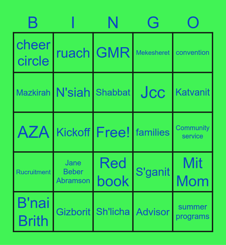 This bingo card has a free space and 24 words: B'nai Brith, Jane Beber Abramson, Shabbat, Advisor, convention, cheer circle, ruach, GMR, families, Community service, AZA, N'siah, S'ganit, Mit Mom, Mazkirah, Gizborit, Sh'licha, Mekesheret, Katvanit, Rucruitment, Kickoff, Red book, Jcc and summer programs.