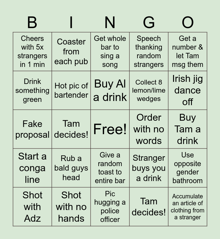 This bingo card has a free space and 29 words: Shot with Adz, Dance on a stage, Tam decides!, Borrow Condon from stranger & put in mouth, Cheers with 5x strangers in 1 min, Get whole bar to sing a song, Hot pic of bartender, Rub a bald guys head, Order with no words, Shot with no hands, Buy Tam a drink, Accumulate an article of clothing from a stranger, Pic hugging a police officer, Tam decides!, Irish jig dance off, Group pic with the most random pple you can find, Give a random toast to entire bar, Start a conga line, Get a number & let Tam msg them, Fake proposal, Stranger buys you a drink, Steal a glass (gotta be cool), Collect 8 lemon/lime wedges, Drink something green, Speech thanking random strangers, Coaster from each pub, Use opposite gender bathroom, Buy Al a drink and Dance with a really old person.
