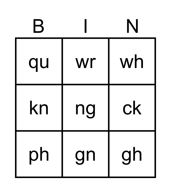 This bingo card has 9 words: ph, wh, wr, kn, qu, ck, ng, gh and gn.