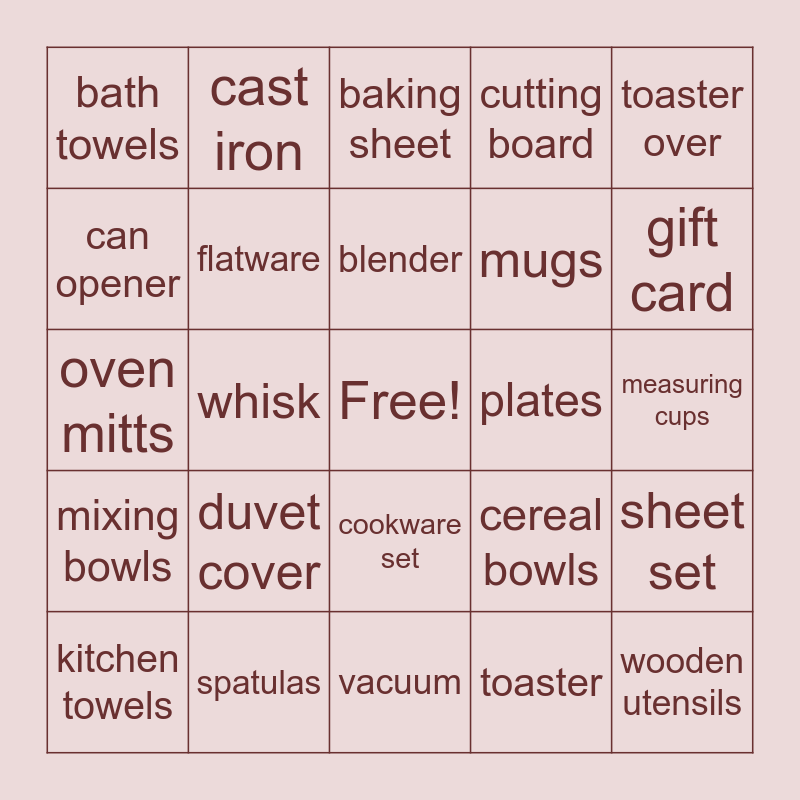 This bingo card has a free space and 37 words: mixer, muffin tin, knife set, flatware, sheet set, duvet cover, blender, wine glasses, toaster over, waffle iron, whisk, cutting board, wooden utensils, measuring cups, can opener, mixing bowls, drinking glasses, baking sheet, cookware set, plates, bath towels, gift card, kitchen towels, vacuum, butter dish, toaster, cast iron, kitchen scale, storage containers, coffee machine, dutch oven, spatulas, oven mitts, stand mixer, cereal bowls, mugs and pillows.