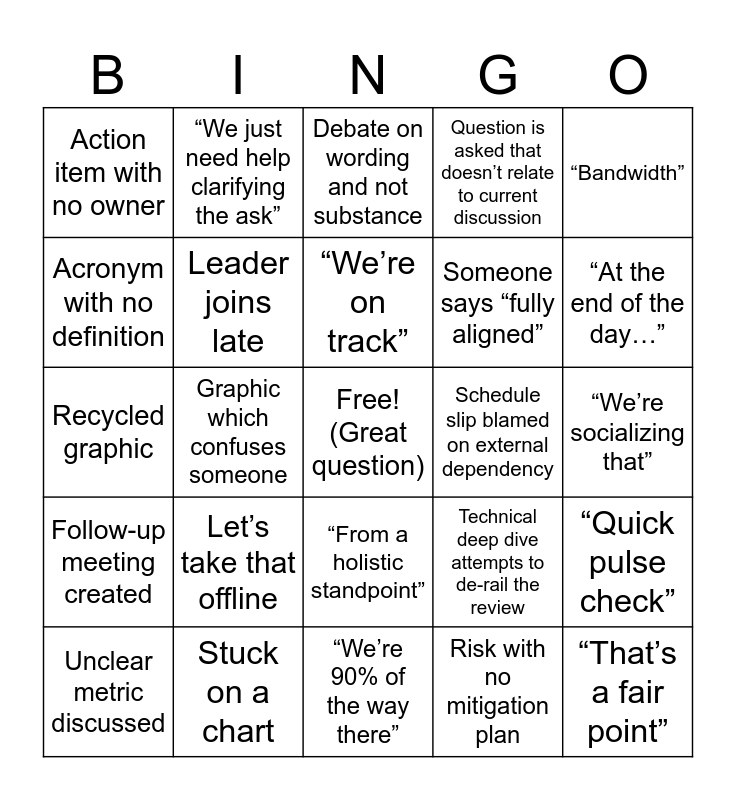 This bingo card has a free space and 24 words: Let’s take that offline, Stuck on a chart, “We’re on track”, Unclear metric discussed, “Bandwidth”, Action item with no owner, Acronym with no definition, “We just need help clarifying the ask”, Schedule slip blamed on external dependency, “From a holistic standpoint”, Someone says “fully aligned”, Recycled graphic, Technical deep dive attempts to de-rail the review, “Quick pulse check”, Leader joins late, Risk with no mitigation plan, “We’re socializing that”, Debate on wording and not substance, “At the end of the day…”, Graphic which confuses someone, “That’s a fair point”, Follow-up meeting created, Question is asked that doesn’t relate to current discussion and “We’re 90% of the way there”.