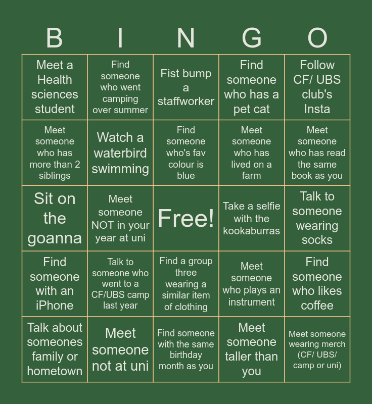 This bingo card has a free space and 29 words: Talk about someones family or hometown, Meet an Ag student, Meet someone NOT in your year at uni, Meet someone in your year at uni, Meet a Health sciences student, Fist bump a staffworker, Watch a waterbird swimming, Talk to someone who went to a CF/UBS camp last year, Take a selfie with the kookaburras, Meet someone not at uni, Talk to someone wearing socks, Meet someone wearing merch (CF/ UBS/ camp or uni), Find someone with the same birthday month as you, Meet someone taller than you, Meet someone who has read the same book as you, Find someone with same number of letters in first name, Find a group three wearing a similar item of clothing, Find someone with an iPhone, Follow CF/ UBS club's Insta, Sit on the goanna, Meet someone who plays an instrument, Find out someones fav book of the Bible, Meet someone who has lived on a farm, Meet someone who has more than 2 siblings, Find someone who has a pet cat, Find someone who went camping over summer, Find someone who likes coffee, Find someone who's fav colour is blue and Find someone who has a birthday this month.