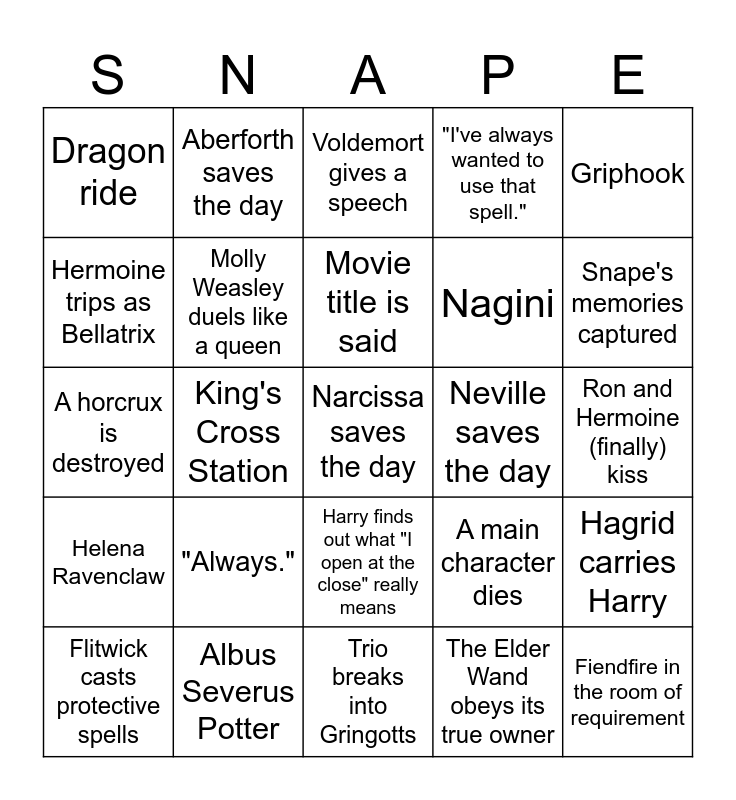 This bingo card has 25 words: "Always.", Trio breaks into Gringotts, Movie title is said, Flitwick casts protective spells, Griphook, Dragon ride, Hermoine trips as Bellatrix, Aberforth saves the day, Neville saves the day, Harry finds out what "I open at the close" really means, Nagini, A horcrux is destroyed, A main character dies, Hagrid carries Harry, Molly Weasley duels like a queen, Fiendfire in the room of requirement, Ron and Hermoine (finally) kiss, Voldemort gives a speech, Snape's memories captured, King's Cross Station, Narcissa saves the day, Albus Severus Potter, Helena Ravenclaw, "I've always wanted to use that spell." and The Elder Wand obeys its true owner.