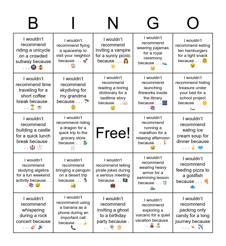 This bingo card has a free space and 33 words: I wouldn’t recommend eating garlic ice cream for breakfast because . . . 🧄 🍦, I wouldn’t recommend wearing a tuxedo for a beach vacation because . . . 🤵 🏖️, I wouldn’t recommend riding a dragon for a quick trip to the grocery store because . . . 🐉 🛒, I wouldn’t recommend bringing a suitcase full of rocks for a hiking trip because . . . 🧳 🪨, I wouldn’t recommend studying algebra for a fun weekend activity because . . . 📚 😅, I wouldn’t recommend skydiving for my grandma because . . . 🪂 👵, I wouldn’t recommend eating ten hamburgers for a light snack because . . . 🍔 😵, I wouldn’t recommend whispering during a rock concert because . . . 🎸 🔊, I wouldn’t recommend flying a spaceship to visit your neighbor because . . . 🚀 🏠, I wouldn’t recommend wearing flip-flops for climbing a snowy mountain because . . . 🩴 🏔️, I wouldn’t recommend reading a boring dictionary for a bedtime story because . . . 📖 😴, I wouldn’t recommend inviting a vampire for a sunny picnic because . . . 🧛 ☀️, I wouldn’t recommend bringing a gold crown for a casual trip to the mall because . . . 👑 🛍️, I wouldn’t recommend eating chili peppers for dessert because . . . 🌶️ 🍰, I wouldn’t recommend running a marathon for a relaxing afternoon because . . . 🏃 😅, I wouldn’t recommend hiding treasure under your bed for a school project because . . . 🪙 🛏️, I wouldn’t recommend using a banana as a phone during an important call because . . . 🍌 📞, I wouldn’t recommend building a castle for a quick lunch break because . . . 🏰 ⏱️, I wouldn’t recommend bringing a penguin on a desert trip because . . . 🐧 🏜️, I wouldn’t recommend wearing heavy armor for a swimming lesson because . . . 🛡️ 🏊, I wouldn’t recommend telling pirate jokes during a serious meeting because . . . 🏴☠️ 💼, I wouldn’t recommend sleeping in class for a big test day because . . . 😴 📝, I wouldn’t recommend riding a unicycle on a crowded subway because . . . 🚇 🤹, I wouldn’t recommend eating ice cream soup for dinner because . . . 🍦 🥣, I wouldn’t recommend inviting a ghost to a birthday party because . . . 👻 🎂, I wouldn’t recommend packing only candy for a long journey because . . . 🍬 ✈️, I wouldn’t recommend wearing pajamas for a royal ceremony because . . . 🛌 👑, I wouldn’t recommend launching fireworks inside the library because . . . 🎆 📚, I wouldn’t recommend time traveling for a short coffee break because . . . ⏳ ☕, I wouldn’t recommend feeding pizza to a goldfish because . . . 🍕 🐟, I wouldn’t recommend bringing a treasure map to a math test because . . . 🗺️ 📝, I wouldn’t recommend exploring a volcano for a quiet vacation because . . . 🌋 🏝️ and I wouldn’t recommend teaching a robot to juggle knives for a school talent show because . . . 🤖 🔪.