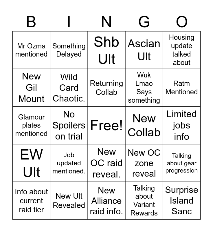 This bingo card has a free space and 24 words: Info about current raid tier, Job updated mentioned., Returning Collab, Talking about Variant Rewards, Housing update talked about, Mr Ozma mentioned, Something Delayed, Shb Ult, New Collab, Limited jobs info, Glamour plates mentioned, Wild Card Chaotic., New OC zone reveal, Talking about gear progression, New Gil Mount, New Ult Revealed, New Alliance raid info., Ascian Ult, Ratm Mentioned, EW Ult, No Spoilers on trial, New OC raid reveal., Wuk Lmao Says something and Surprise Island Sanc.