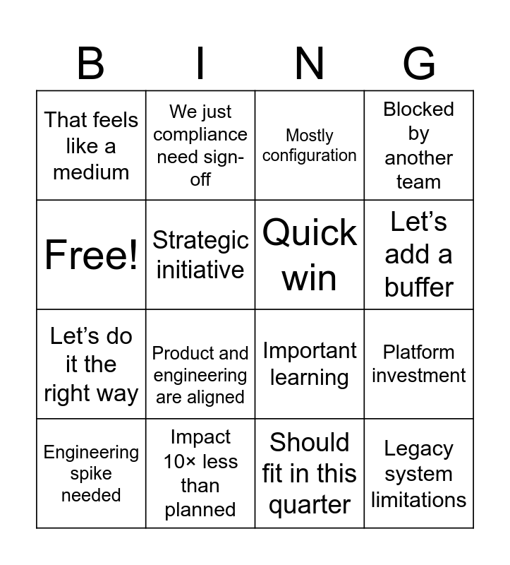 This bingo card has 16 words: Impact 10× less than planned, Platform investment, Mostly configuration, That feels like a medium, Let’s do it the right way, We just compliance need sign-off, Important learning, Should fit in this quarter, Free!, Strategic initiative, Engineering spike needed, Blocked by another team, Product and engineering are aligned, Let’s add a buffer, Quick win and Legacy system limitations.