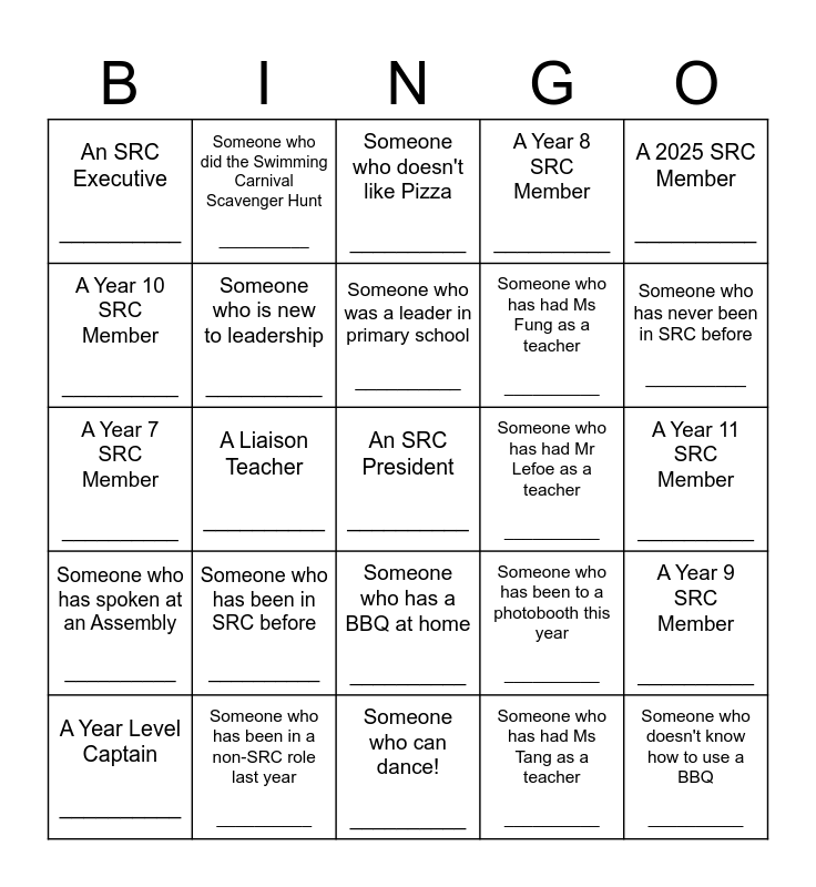 This bingo card has 25 words: Someone who has been in SRC before __________, Someone who can dance! __________, Someone who was a leader in primary school __________, A Year Level Captain __________, A 2025 SRC Member __________, An SRC Executive __________, A Year 10 SRC Member __________, Someone who did the Swimming Carnival Scavenger Hunt __________, Someone who has had Mr Lefoe as a teacher __________, Someone who has a BBQ at home __________, Someone who has had Ms Fung as a teacher __________, A Year 7 SRC Member __________, Someone who has been to a photobooth this year __________, A Year 9 SRC Member __________, Someone who is new to leadership __________, Someone who doesn't know how to use a BBQ __________, A Year 11 SRC Member __________, Someone who doesn't like Pizza __________, Someone who has never been in SRC before __________, A Liaison Teacher __________, An SRC President __________, Someone who has been in a non-SRC role last year __________, Someone who has spoken at an Assembly __________, A Year 8 SRC Member __________ and Someone who has had Ms Tang as a teacher __________.
