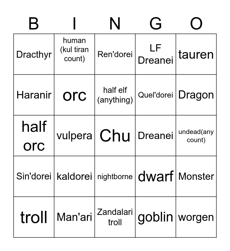 This bingo card has a free space and 24 words: kaldorei, Man'ari, half elf (anything), troll, tauren, Dracthyr, Haranir, human (kul tiran count), Dreanei, nightborne, Quel'dorei, half orc, dwarf, Monster, orc, goblin, undead(any count), Ren'dorei, Dragon, vulpera, worgen, Sin'dorei, LF Dreanei and Zandalari troll.