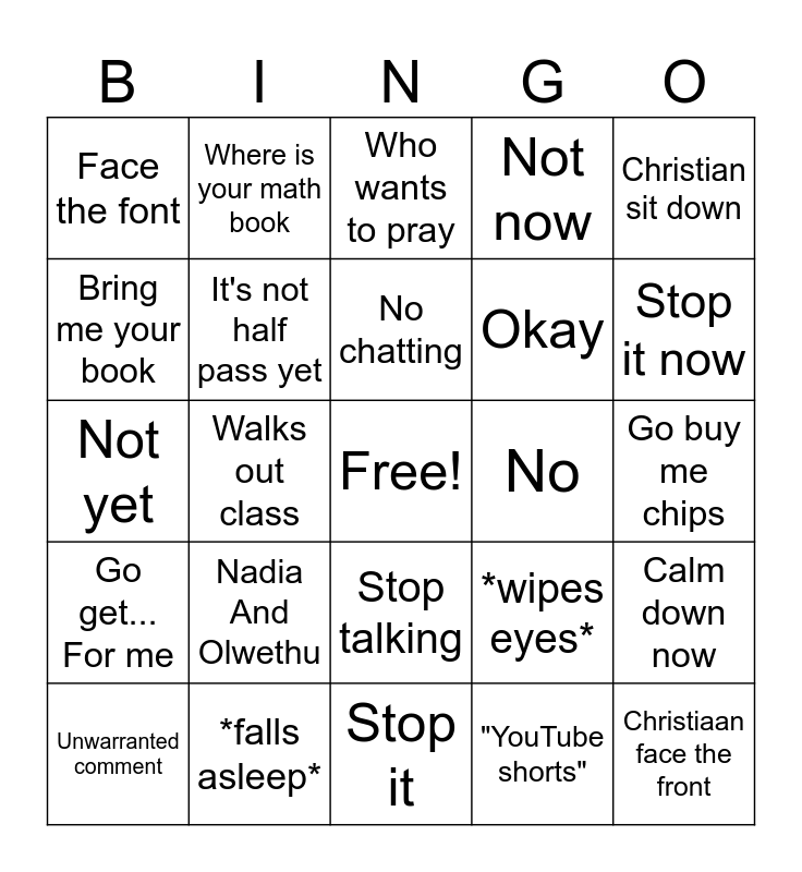 This bingo card has a free space and 24 words: Nadia And Olwethu, *falls asleep*, No chatting, Unwarranted comment, Christian sit down, Face the font, Bring me your book, Where is your math book, No, Stop talking, Okay, Not yet, *wipes eyes*, Calm down now, It's not half pass yet, "YouTube shorts", Go buy me chips, Who wants to pray, Stop it now, Walks out class, Christiaan face the front, Go get... For me, Not now and Stop it.