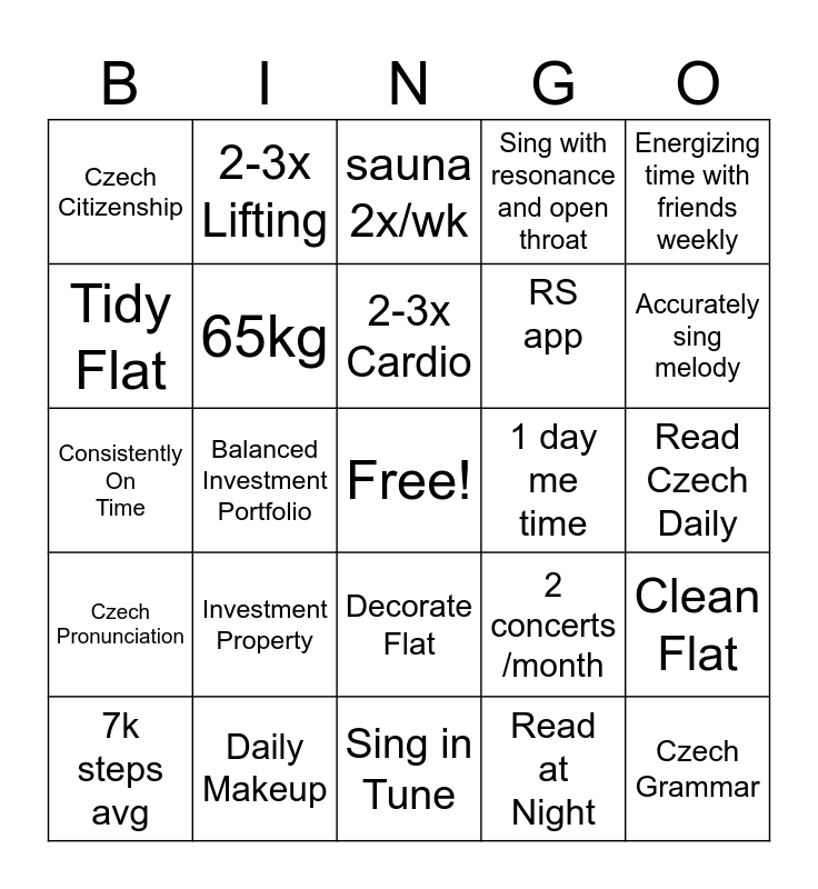 This bingo card has a free space and 24 words: Investment Property, Daily Makeup, 2-3x Cardio, 7k steps avg, Energizing time with friends weekly, Czech Citizenship, Tidy Flat, 2-3x Lifting, 1 day me time, Decorate Flat, RS app, Consistently On Time, 2 concerts /month, Clean Flat, 65kg, Read at Night, Read Czech Daily, sauna 2x/wk, Accurately sing melody, Balanced Investment Portfolio, Czech Grammar, Czech Pronunciation, Sing with resonance and open throat and Sing in Tune.