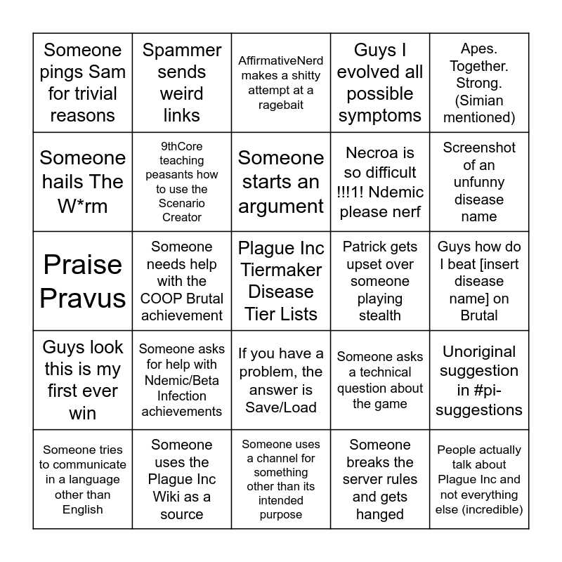 This bingo card has 25 words: Someone asks for help with Ndemic/Beta Infection achievements, Someone uses a channel for something other than its intended purpose, Someone starts an argument, Someone tries to communicate in a language other than English, Apes. Together. Strong. (Simian mentioned), Someone pings Sam for trivial reasons, Someone hails The W*rm, Spammer sends weird links, Patrick gets upset over someone playing stealth, If you have a problem, the answer is Save/Load, Necroa is so difficult !!!1! Ndemic please nerf, Praise Pravus, Someone asks a technical question about the game, Unoriginal suggestion in #pi-suggestions, 9thCore teaching peasants how to use the Scenario Creator, People actually talk about Plague Inc and not everything else (incredible), Guys how do I beat [insert disease name] on Brutal, AffirmativeNerd makes a shitty attempt at a ragebait, Screenshot of an unfunny disease name, Someone needs help with the COOP Brutal achievement, Plague Inc Tiermaker Disease Tier Lists, Someone uses the Plague Inc Wiki as a source, Guys look this is my first ever win, Guys I evolved all possible symptoms and Someone breaks the server rules and gets hanged.