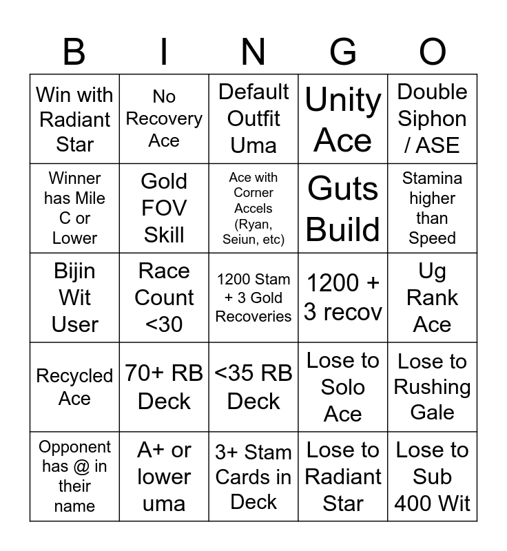This bingo card has a free space and 26 words: <35 RB Deck, Lose to Radiant Star, Ace with Corner Accels (Ryan, Seiun, etc), A+ or lower uma, Double Siphon / ASE, Win with Radiant Star, Winner has Mile C or Lower, No Recovery Ace, Ug Rank Ace, Lose to Solo Ace, Guts Build, Bijin Wit User, Lose to Rushing Gale, Opponent has @ in their name, Race Count <30, Front Ace w/o TTL and GW, Unity Ace, Recycled Ace, Default Outfit Uma, Lose to Sub 400 Wit, Stamina higher than Speed, 3+ Stam Cards in Deck, 1200 + 3 recov, 70+ RB Deck, Gold FOV Skill and Super Lucky 7 Ace Wins.