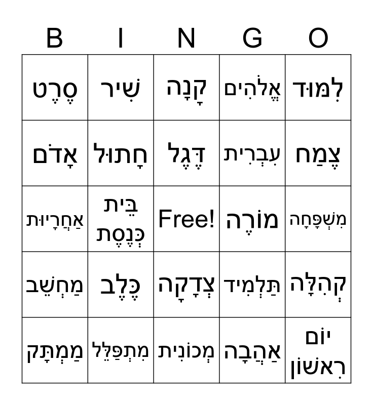 This bingo card has a free space and 24 words: כֶּלֶב, מִתְפַּלֵּל, דֶּגֶל, מַמְתָּק, לִמּוּד, סֶרֶט, אָדֹם, שִׁיר, מוֹרֶה, צְדָקָה, עִבְרִית, אַחֲרָיוּת, תַּלְמִיד, קְהִלָּה, חָתוּל, אַהֲבָה, מִשְׁפָּחָה, קָנָה, צֶמַח, בֵּית כְּנֶסֶת, יוֹם רִאשׁוֹן, מַחְשֵׁב, אֱלֹהִים and מְכוֹנִית.