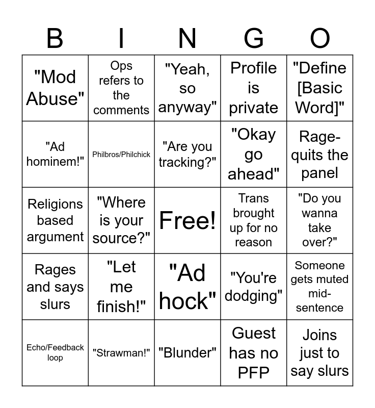 This bingo card has a free space and 24 words: "Let me finish!", "Strawman!", "Are you tracking?", Echo/Feedback loop, "Define [Basic Word]", "Mod Abuse", "Ad hominem!", Ops refers to the comments, Trans brought up for no reason, "Ad hock", "Okay go ahead", Religions based argument, "You're dodging", Someone gets muted mid-sentence, Philbros/Philchick, Guest has no PFP, "Do you wanna take over?", "Yeah, so anyway", Rage-quits the panel, "Where is your source?", Joins just to say slurs, Rages and says slurs, Profile is private and "Blunder".