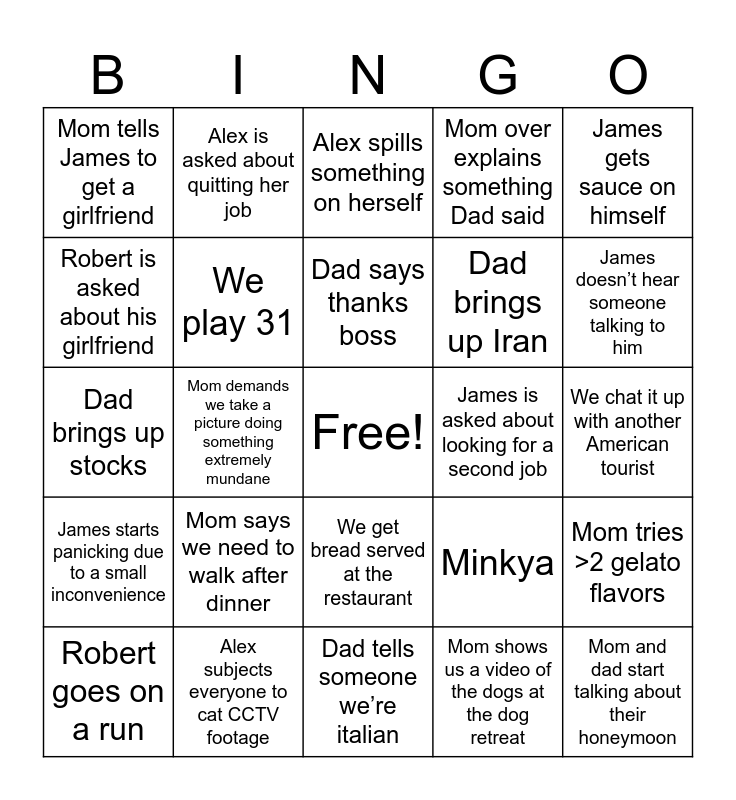 This bingo card has a free space and 25 words: Mom says we need to walk after dinner, Dad tells someone we’re italian, Dad says thanks boss, Robert goes on a run, James gets sauce on himself, Mom tells James to get a girlfriend, Robert is asked about his girlfriend, Alex is asked about quitting her job, James is asked about looking for a second job, We get bread served at the restaurant, Dad brings up Iran, Dad brings up stocks, Minkya, Mom tries >2 gelato flavors, We play 31, Bruschetta is ordered, We chat it up with another American tourist, Alex spills something on herself, James doesn’t hear someone talking to him, Mom demands we take a picture doing something extremely mundane, Mom and dad start talking about their honeymoon, Alex subjects everyone to cat CCTV footage, James starts panicking due to a small inconvenience, Mom over explains something Dad said and Mom shows us a video of the dogs at the dog retreat.