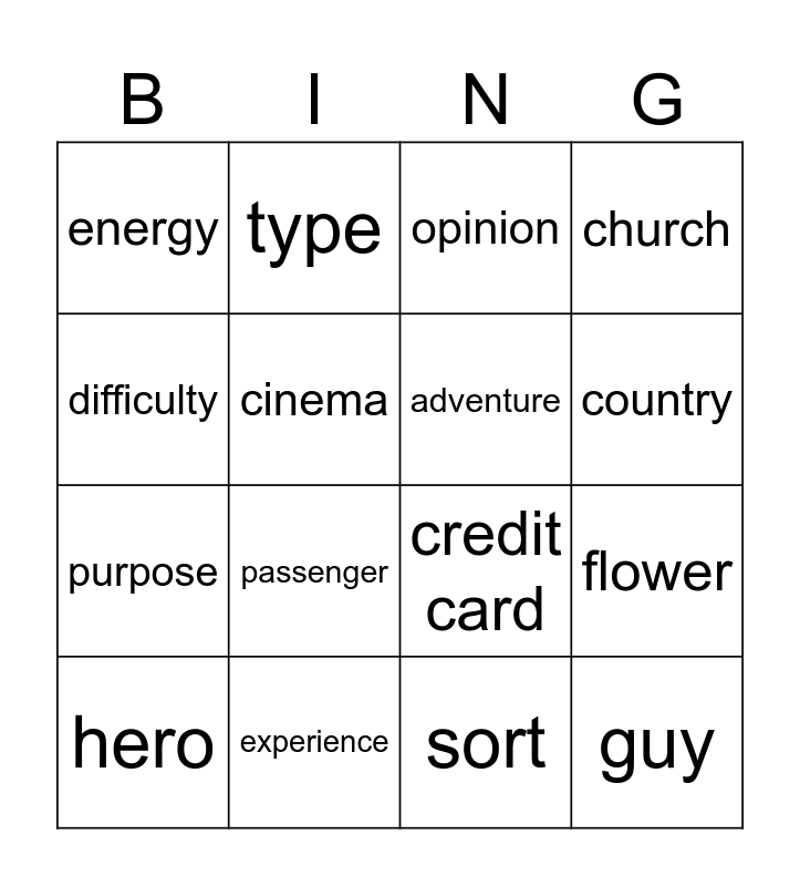 This bingo card has 35 words: Free!, action, advantage, adventure, arrival, church, cinema, conversation, country, couple, credit card, difficulty, Earth, effect, energy, experience, flight, flower, guy, hero, line, mail, midnight, mosque, opinion, passenger, pilot, plane, purpose, sort, space, synagogue, ticket, type and vacation.