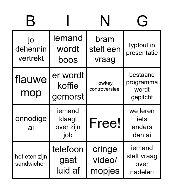 This bingo card has 21 words: telefoon gaat luid af, probleem met eten, iemand wordt boos, technisch probleem, cringe video/ mopjes, lowkey controversieel, jo dehennin vertrekt, bram stelt een vraag, Free!, bestaand programma wordt gepitcht, onnodige ai, typfout in presentatie, iemand stelt vraag over nadelen, vaag tabblad staat open, er wordt koffie gemorst, hallo kroket krijgt credits, het eten zijn sandwichen, iemand klaagt over zijn job, flauwe mop, we leren iets anders dan ai and tis plezant.